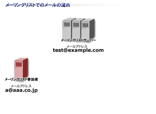 | メーリングリストサーバーは、参加者(図の場合は、a@aaa.co.jpという人物)からのメールを受信し、参加者全員にそのメールを同報配信します。元のメールの送信者であるa@aaa.co.jpにも、同様に同報配信されます。